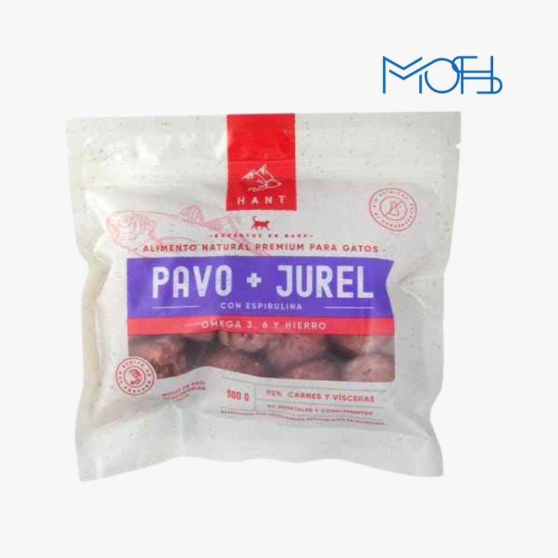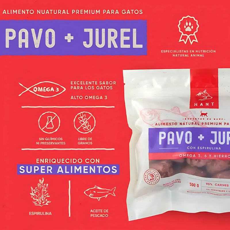 Con Hant Gato: Pavo + Jurel, tu gato disfrutará de un sabor delicioso y de una nutrición completa que apoyará su salud y vitalidad.